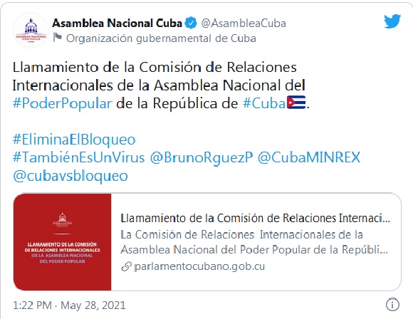 Por vigésima octava ocasión, el próximo 23 de junio se someterá en las Naciones Unidas la resolución Necesidad de poner fin al bloqueo económico, comercial y financiero de los Estados Unidos contra Cuba, una oportunidad donde el mundo entero levantará una vez más sus voces de apoyo a la nación caribeña y condenará la criminal política de la Casa Blanca. (ACN) (Foto: Twitter ANPP)