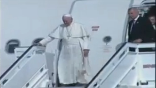 El Papa Francisco llega al Aeropuerto Internacional “Frank País” de Holguín. Es despedido por el Primer Vicepresidente cubano Miguel Díaz-Canel, por le Presidente del gobierno de la provincia de Holguín, y por el Monseñor Emilio Aranguren, Obispo de Holguín.