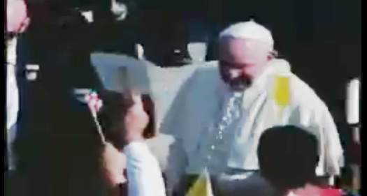 El Papa Francisco va a la salida del Santuario. Besa a los niños que le regalan una imagen de la Virgen de la Caridad.