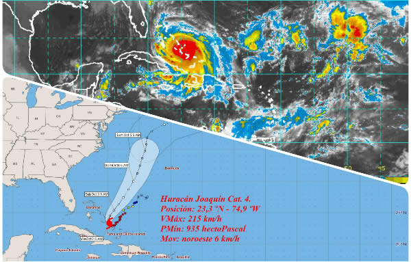 La Habana, 2 oct.- El Centro de Pronósticos del Instituto de Meteorología informó que a las 6:00 de la mañana de hoy, el centro del intenso huracán Joaquín fue estimado en los 23.3 grados de latitud norte y los 74.9 grados de longitud oeste, posición que lo sitúa a unos 330 kilómetros al sudeste de Nassau, en las Bahamas septentrionales. Joaquín ha inclinado ahora su rumbo al noroeste, a 6 kilómetros por hora.