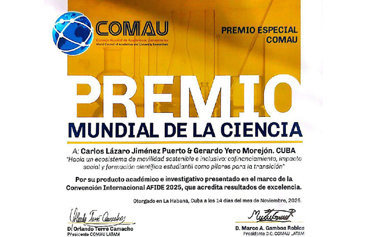 Ciego de Ávila, 13 nov.- La integralidad y los resultados de un proyecto investigativo sobre movilidad sostenible e inclusiva en la provincia de Sancti Spíritus fueron reconocidos con el Premio Mundial de la Ciencia, otorgado por el Consejo Mundial de Académicos Universitarios (Comau).