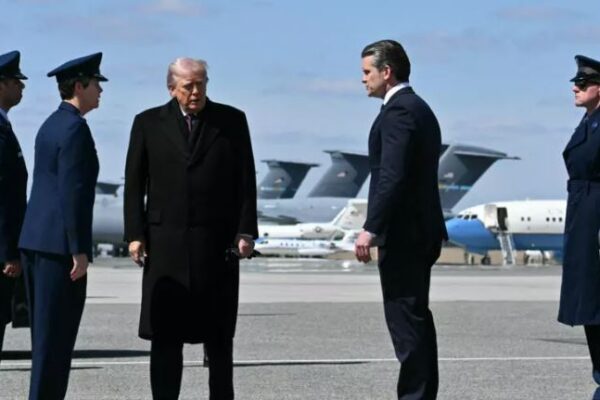 EE.UU, 19 mar.- El presidente de Estados Unidos, Donald Trump, y el secretario de Defensa, Pete Hegseth, llegan a la Base de la Fuerza Aérea de Dover para asistir a la ceremonia de repatración de restos de soldados, en Dover, Delaware, el 18 de marzo de 2026.